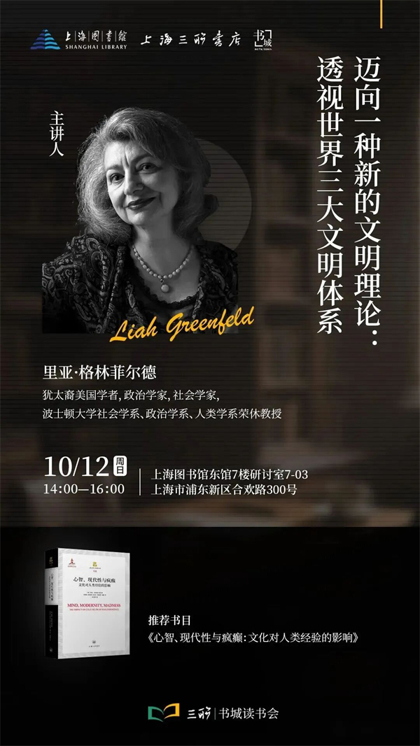 里亚格林菲尔德女士(Liah Greenfeld)是国际知名的政治学家、社会学家,曾在哈佛大学、芝加哥大学任教,因其对民族主义问题的研究而享有声誉。她一直致力于从诸多层面对人类社会的现实进行科学解释,其研究范围涵盖从个体心智到社会文明的各个领域。她被称为当代“最具反传统精神”的社会学家,她的方法被视为社会科学主流方法之外的一种重大替代方案。10月12日下午,里亚格林菲尔德教授将在上海图书馆东馆7楼研讨室举行题为“迈向一种新的文明理论:透视世界三大文明体系”的讲座,内容将涉及她最新的研究成果。本次讲座旨在阐明一个可用于跨文化传播与全球文明研究的通用理论框架。