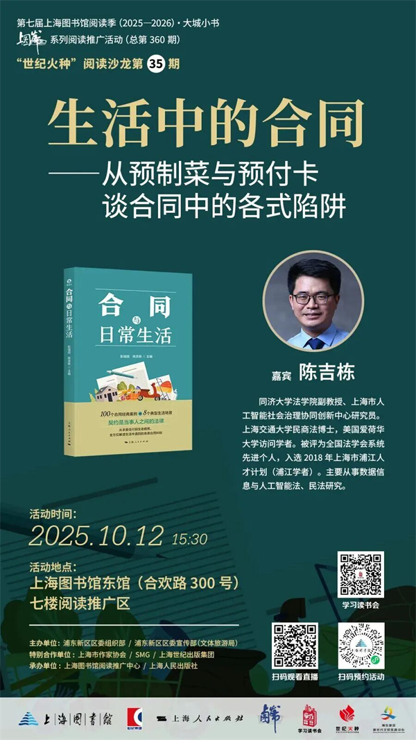 近日,有关“预制菜”的风波不断升级,由此引发了消费市场的极大关注。10月12日,同济大学法学院副教授、上海市人工智能社会治理协同创新中心研究员、《合同与日常生活》的主编之一陈吉栋将做客上海图书馆东馆,从预制菜与预付卡谈合同中的各式陷阱。