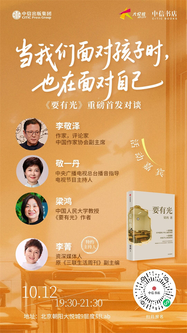 非虚构代表作家、中国人民大学教授梁鸿的新书《要有光》,9月正式出版上市了。这一次,她把写作对象投向那些因为情绪问题而失学、休学在家的孩子以及在退学和抑郁边缘挣扎的孩子,记录他们真实的声音,呈现当代中国青少年的心理图景。10月12日晚,《要有光》新书首发活动重磅来袭。梁鸿老师将携新书做客中信书店,同李敬泽、敬一丹、李菁三位老师一同畅谈爱与成长,重新认识我们最爱的孩子,认识世界,最终认识我们自己。