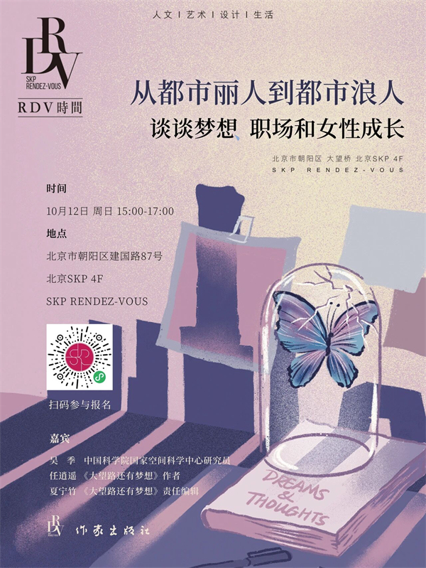 一个大望路的“都市丽人”,是如何变成了“都市浪人”并写出一本有趣的“反职场”小说的呢?10月12日下午,我们邀请到了中国科学院国家空间科学中心研究员吴季、《大望路还有梦想》作者任逍遥以及《大望路还有梦想》责任编辑夏宁竹做客SKP,与我们共同探讨职场和女性成长。