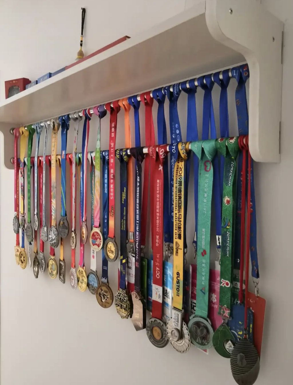 拥有10年跑龄的陈波娜,在家里也有自己的奖牌墙。