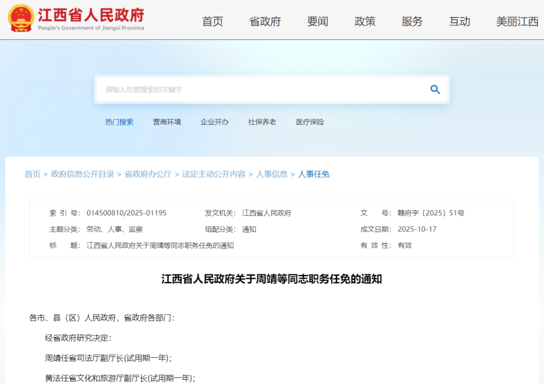 正文 江西任免一批领导干部,周靖任省司法厅副厅长 亿通速配 V管理员 /2025-10-23 17:20:03/1阅读/0评论 1023 文章最后更新时间2025年10月23日,若文章内容或图片失效,请留言反馈! 江西省人民政府关于周靖等同志职务任免的通知各市、县(区)人民政府,省政府各部门:经省政府研究决定:周靖任省司法厅副厅长(试用期一年);黄法任省文化和旅游厅副厅长(试用期一年);陈义平任省审计厅副厅长,免去其省经济责任审计工作联席会议办公室主任职务;郭莉任赣南师范大学副校长(试用期一年)。2025年10月17日(此件主动公开)原标题《最新!江西任免一批领导干部》