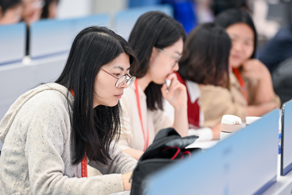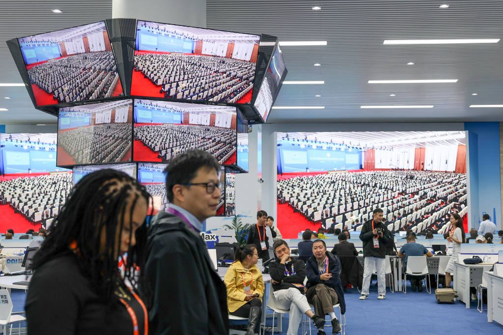 2025年11月5日,第八届进博会在国家会展中心(上海)开幕,中外媒体记者在新闻中心聚焦进博会开幕式。澎湃新闻记者 朱伟辉 图