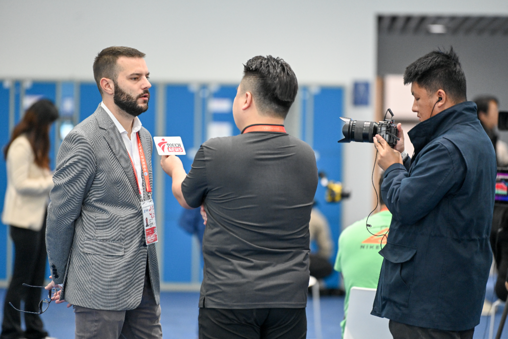 外国媒体记者接受中国媒体记者采访。澎湃新闻记者 朱伟辉 图