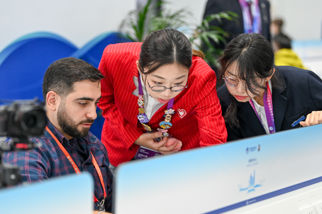 志愿者帮助外国记者解决问题。澎湃新闻记者 朱伟辉 图