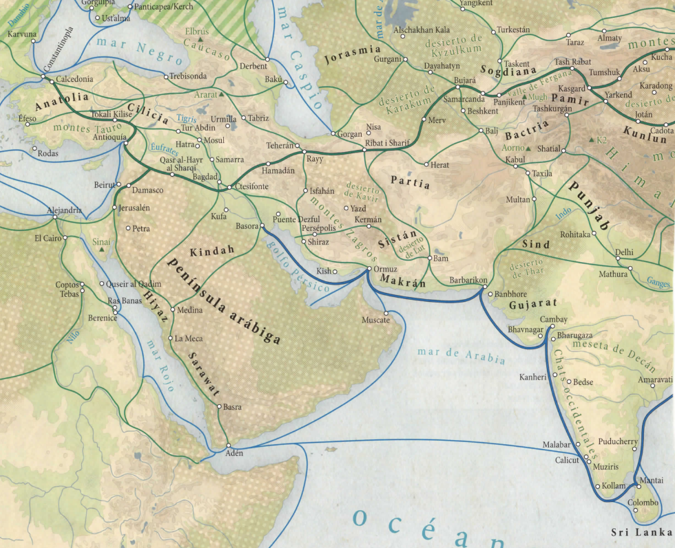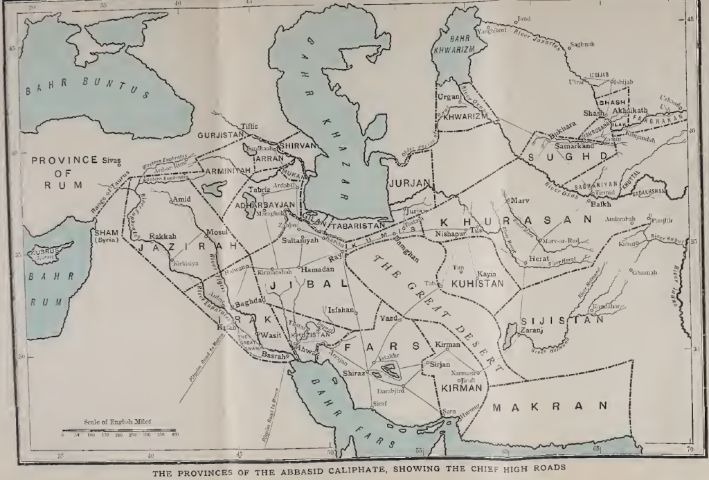 斯特兰奇的历史地理著作《东哈里发之地:从穆斯林征服到帖木儿时代的美索不达米亚、波斯和中亚》(The lands of the eastern caliphate : Mesopotamia, Persia, and Central Asia, from the Moslem conquest to the time of Timur),所附这幅历史地图很有参考价值。图中标注的地中海为“罗马海”(Bahr Rum),阿拉伯人也称地中海为“绿海”(Green Sea)。里海为“可萨海”(Bahr Khazar ),得名于当时的里海北岸的可萨王国。咸海为“花剌子模海”(Bahr Khwarizm),波斯湾为“法尔斯海”(Bahr Fars)。阿拉伯人称黑海为“Bahr Buntus”,意为“黑色的海”。该书中文译本名《大食东部历史地理研究》,2018年社会科学出版社出版,译者为韩中义,译笔典雅,译名考究,注释详实。唯书中所翻印的地图字迹模糊,逊于原书地图。