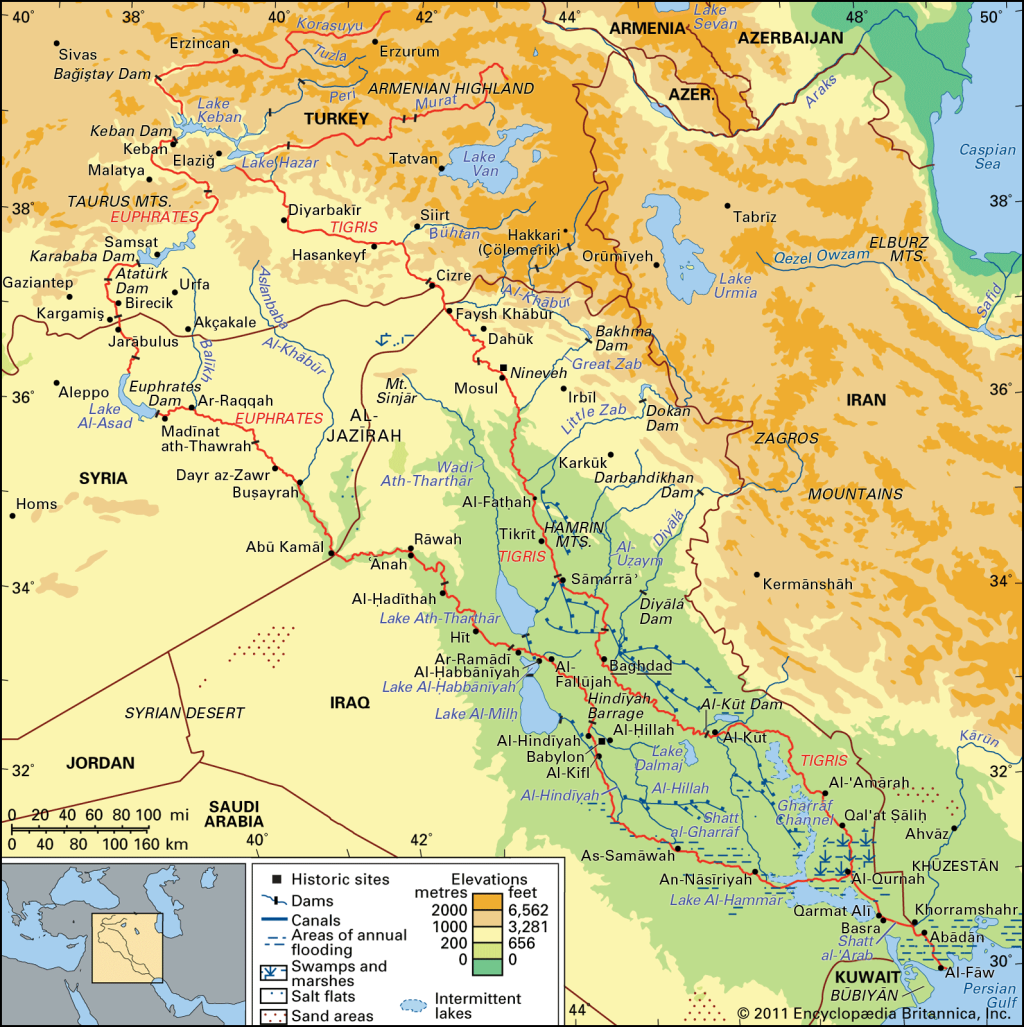 底格里斯河和幼发拉底河水系图 来源: https://www.britannica.com/place/