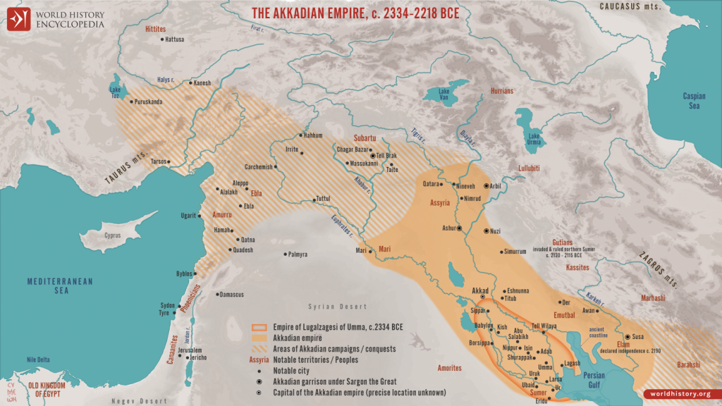 阿卡德帝国全盛时期(公元前2334年至公元前2218年)疆域图。Source:https://www.worldhistory.org