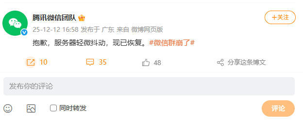 正文 腾讯微信团队就“微信群崩了”致歉:服务器轻微抖动,已恢复 亿通速配 V管理员 /2025-12-12 17:20:03/2阅读/0评论 1212 文章最后更新时间2025年12月12日,若文章内容或图片失效,请留言反馈! @腾讯微信团队 发文回应“微信群崩了”:抱歉,服务器轻微抖动,现已恢复。