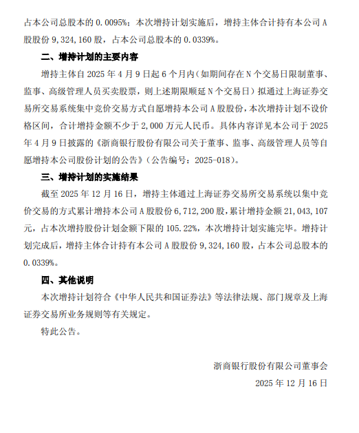 正文 浙商银行披露董监高增持计划进展:已累计增持671.22万股公司股份 亿通速配 V管理员 /2025-12-16 18:50:03/3阅读/0评论 1216 文章最后更新时间2025年12月16日,若文章内容或图片失效,请留言反馈! 12月16日金融一线消息,公告称,截至2025年12月16日,本公司部分董事、监事、高级管理人员及总行部门、分行、子公司主要负责人通过上海证券交易所系统以集中竞价交易方式累计增持本公司A股股份671.22万股,累计增持金额2104.31万元,占本次增持股份计划金额下限的105.22%,本次增持计划实施完毕。