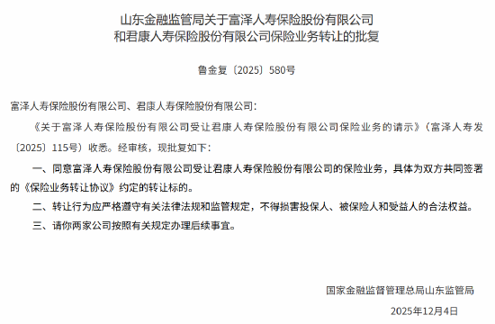另外,批复显示,2025年12月4日,山东金融监管局同意富泽人寿保险股份有限公司受让君康人寿保险股份有限公司的保险业务,具体为双方共同签署的《保险业务转让协议》约定的转让标的。