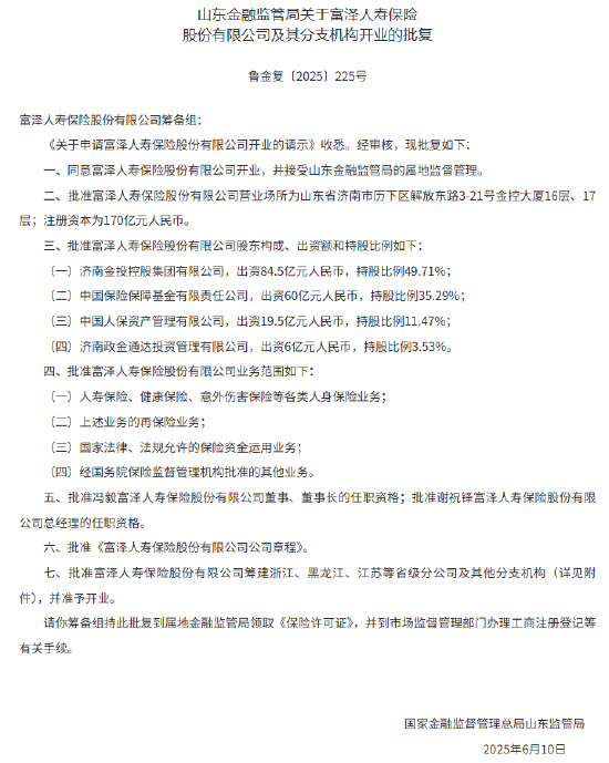 山东金融监管局最新批复显示,2025年6月10日,山东金融监管局同意富泽人寿保险股份有限公司开业,并接受山东金融监管局的属地监督管理。批复称,批准富泽人寿保险股份有限公司营业场所为山东省济南市历下区解放东路3-21号金控大厦16层、17层;注册资本为170亿元人民币。