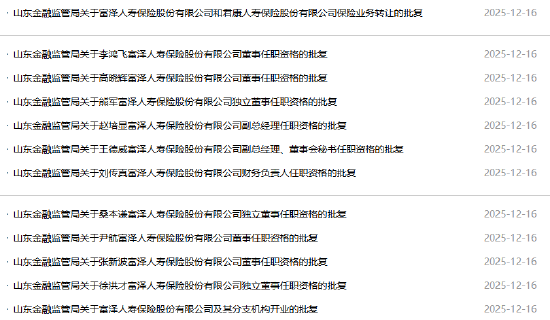山东金融监管局还一连发布多条相关人事批复,批复信息显示,2025年10月22日至2025年11月24日,山东金融监管局陆续核准多名富泽人寿董监高的任职资格。