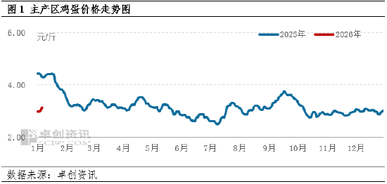 存栏微降,供应压力略有缓解。1月份新开产蛋鸡是2025年9月份补栏的鸡苗,此阶段养殖盈利欠佳,养殖企业补栏积极性不高,因此1月份新开产蛋鸡数量环比减少。老母鸡出栏方面,养殖企业大多计划春节前出栏老鸡,1月老母鸡出栏量或增加。综合来看,1月份老母鸡出栏量大于新开产蛋鸡数量,在产蛋鸡存栏量小幅下滑,预计1月份在产蛋鸡存栏量理论值或在13.34亿只左右,环比下降0.74%。存栏量微降,鸡蛋供应压力缓解。
